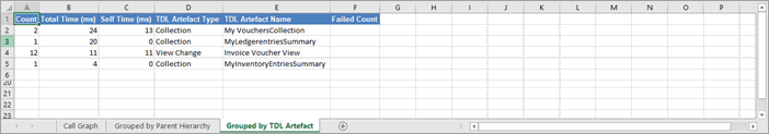 The data in this section is grouped based on the Parent Hierarchy. For example, if a TDL artefact appears more than once under a parent hierarchy, then the data of the TDL artefact is grouped.
