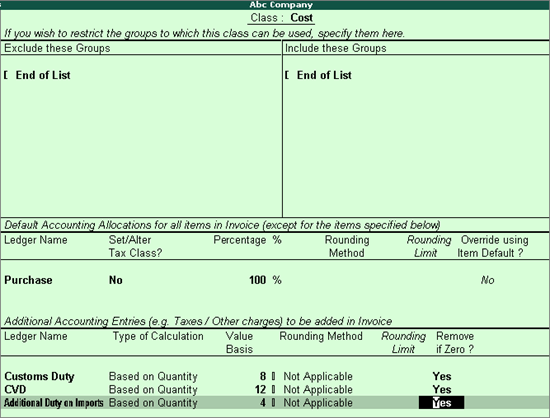 You can create a ledger classification for customer duty applicable for excise for importers. To configure a voucher class, alter the purchase voucher type and make the necessary changes.