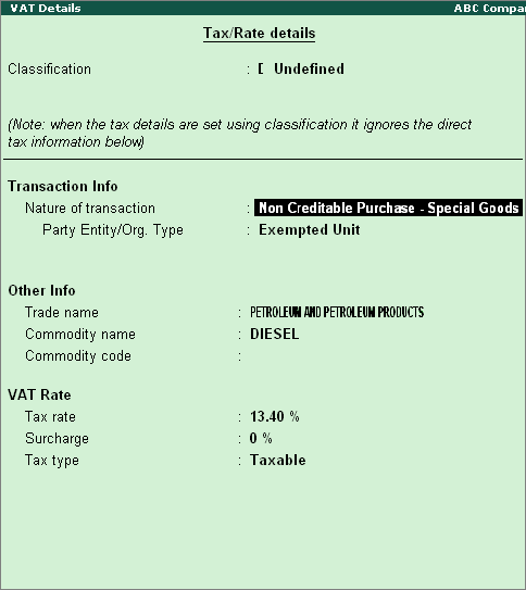 Select Non Creditable Purchase - Special Goods as the Nature of Transaction in the VAT Details screen of purchase ledger grouped under Purchase Accounts .