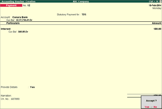Let us now see how the payment of Interest is handled in Tally.ERP 9, when the Payment entry doesn't have a TDS ledger included.