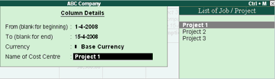 2.    Select the Job/Project to be compared in the field Name of Cost Centre.
