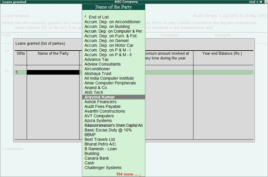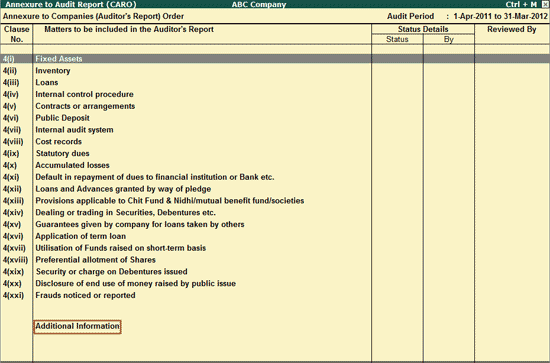 Annexures to Auditor’s Report (CARO) has been added to Tally.ERP 9 to enable auditors to adhere to this checklist consisting of 21 clauses, covering the items that are required to be included in the Auditor’s Report.