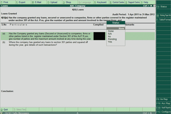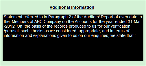 1.    Go to Gateway of Tally > Audit & Compliance > Audit Documentation > Annexures to Auditor’s Report (CARO).