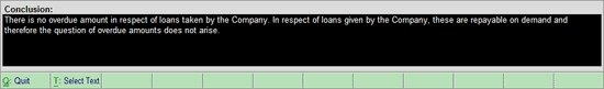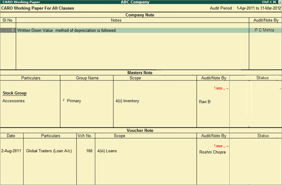 Audit Working Notes, utilized as a means of reference for audit work performed, can be marked for CARO Reporting. Working Notes added at Company, Master, and Voucher Levels and tagged for CARO Reporting will be displayed in CARO Working Paper. To view CARO Working Paper, press Ctrl+W.