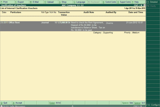 The List of Internal Clarification Vouchers screen displays the Voucher details for which the Clarification is asked by another user within the organisation along with the Audit Note and Name of the User (Audited By).