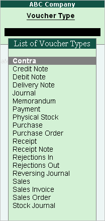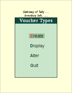 Selecting these options brings up a List of Voucher Types, from which you can select the one you want to view or work on. Apart from the heading, the Voucher Type Display/Alter screens are identical to the Creation screen.