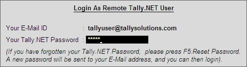 By logging in as a Remote Tally.NET User, you can login and access data from any location. Users created under Tally.NET User or Tally.NET Auditor can login remotely. Tally.NET User or Tally.NET Auditor can use a licensed version of Tally.ERP 9, or use the application in Educational Mode on the remote computer.