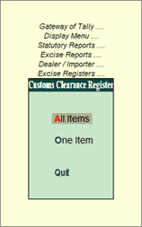 1.    Go to Gateway of Tally > Display > Statutory Reports > Excise Reports > Dealer/Importer> Customs Clearance Register.