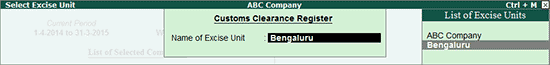 2.    Select the Name of Excise Unit, Name of Tariff, and Name of Item in the Select Excise Unit screen to generate Customs Clearance Register for one item.