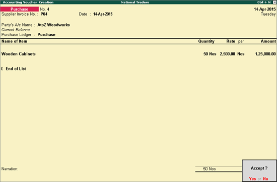 1.    Go to Gateway of Tally > Accounting Vouchers > F9: Purchase.