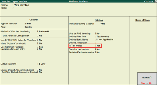 1.    Go to Gateway of Tally > Accounts Info. > Voucher Types > Create to open the Voucher Type Creation screen.