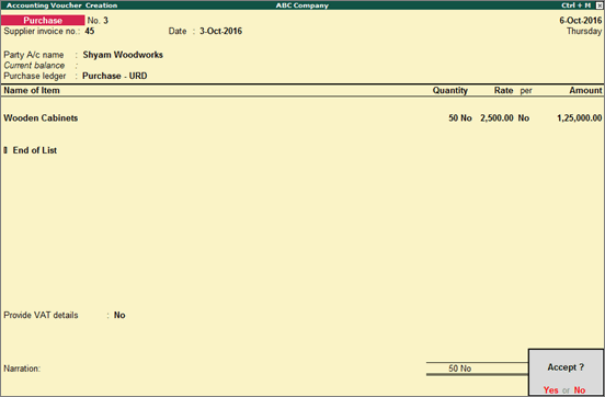 4.    Select the purchase ledger predefined with Purchase From Unregistered Dealer as the Nature of transaction.