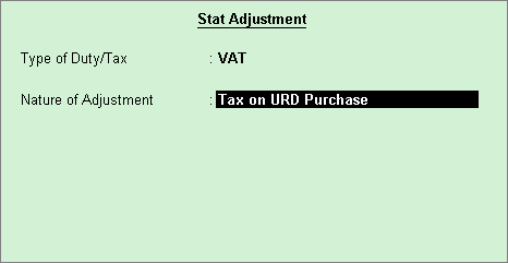 Input tax adjustments for purchases done from URD can be recorded in Tally.ERP 9 from the voucher, by making necessary stat adjustments. You can create a VAT ledger during voucher creation and specify the rate and commodity information in the VAT Details screen.