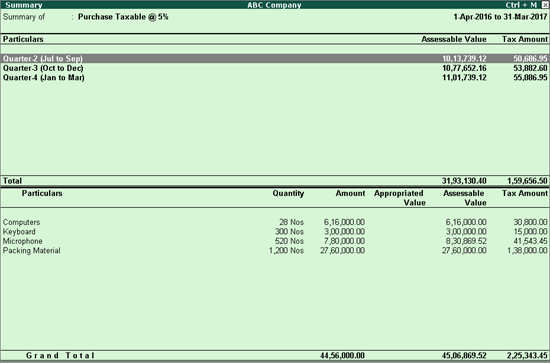Similarly, quarter-wise purchase value for other VAT rate can be displayed by drilling down VAT rate row in the report.