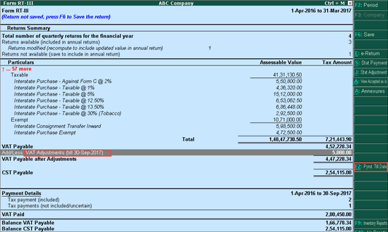 Adjustment transaction for annual return are recorded by selecting the entire financial year as the period in the Statutory Details screen of the journal voucher. Drill down from VAT Adjustments row to display the list of adjustment transactions recorded for annual return.