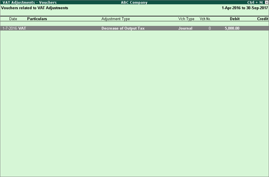 The various types of VAT adjustments done can either increase or decrease the liability/input credit. The VAT adjustment entries display only the aggregate value of input and output VAT.