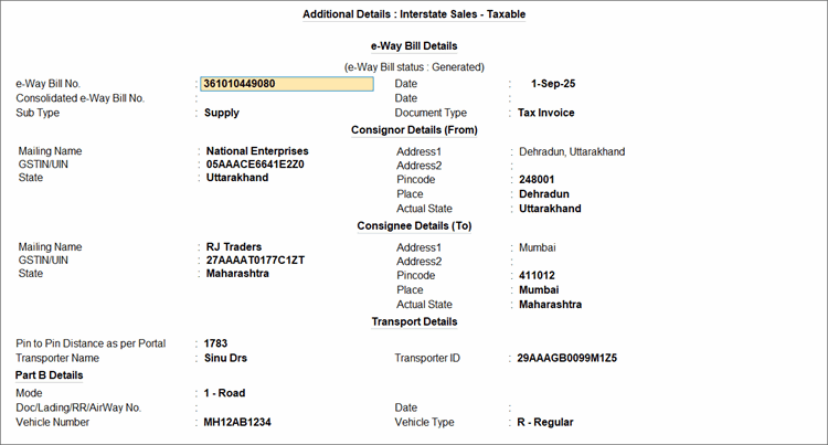 - Set Provide GST/e-Way Bill details to Yes and update the e-Way Bill details in the Additional Details screen.
