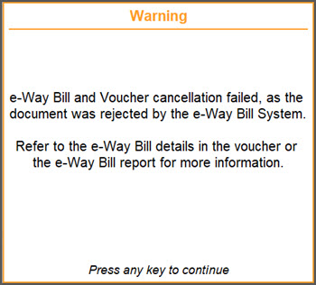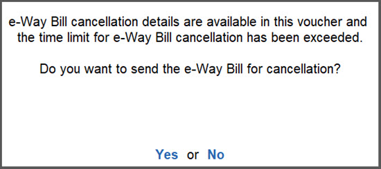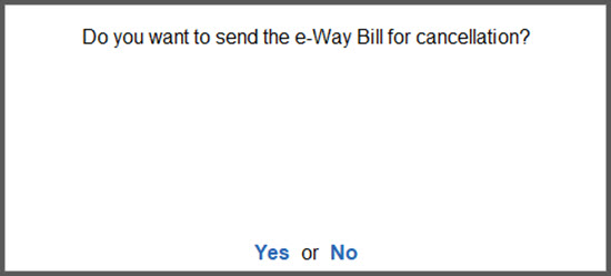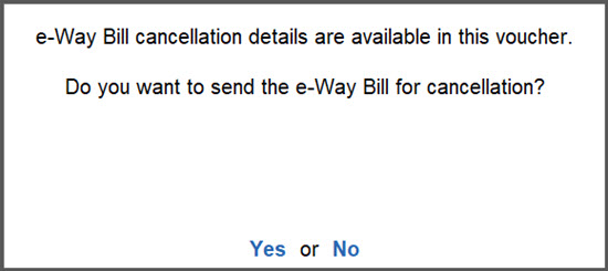 If you select No, the cancellation details will remain in the voucher but you cannot proceed with the cancellation of the e-Way Bill.