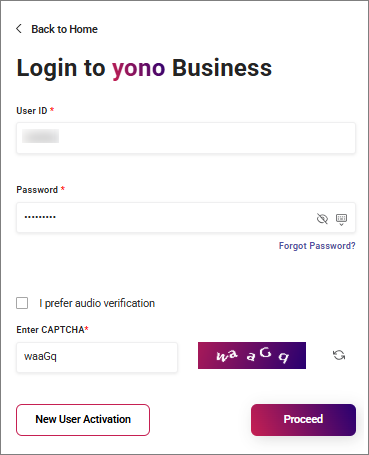 Consequently, you get redirected to the bank portal. - Log in to YONO Business SBI portal.