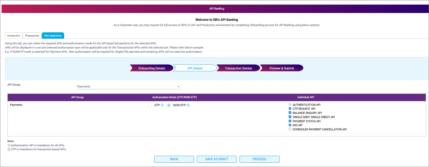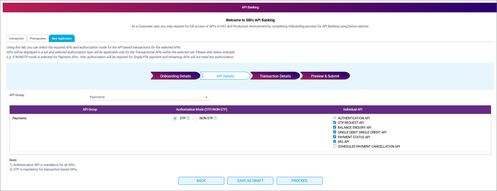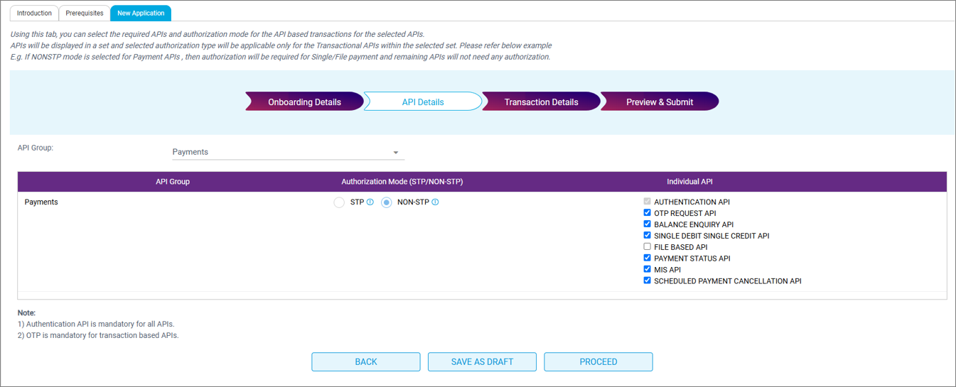 - In the API Details page, select API Group as Payments, and click PROCEED.