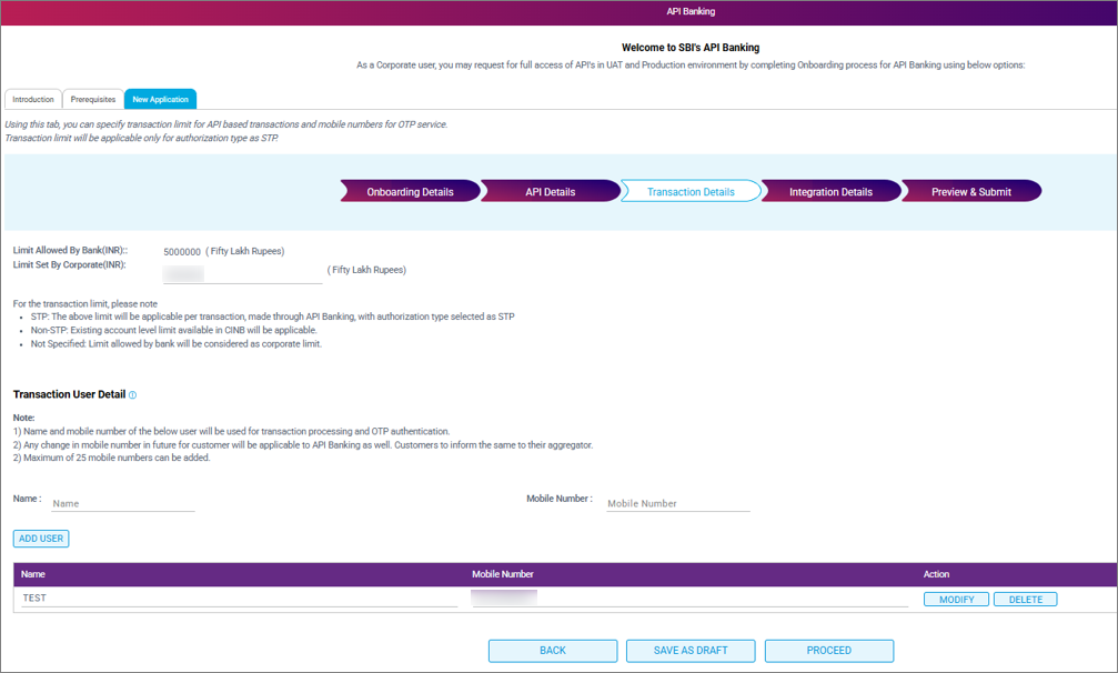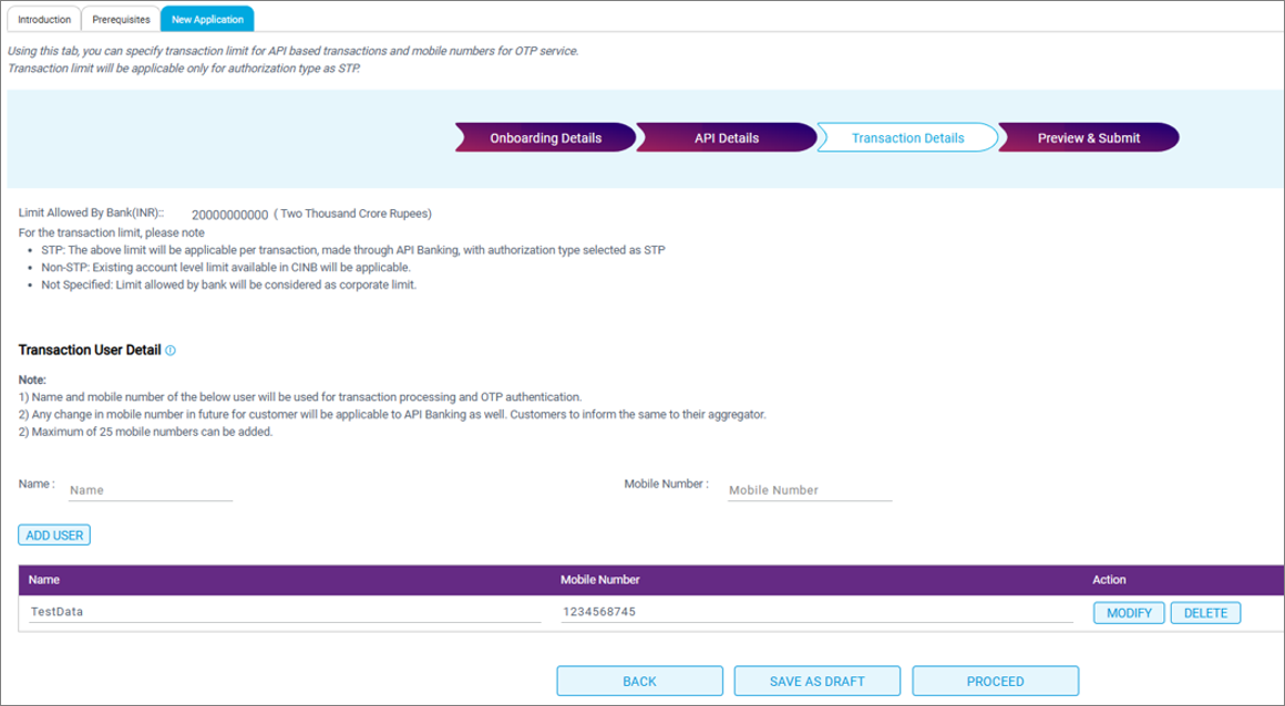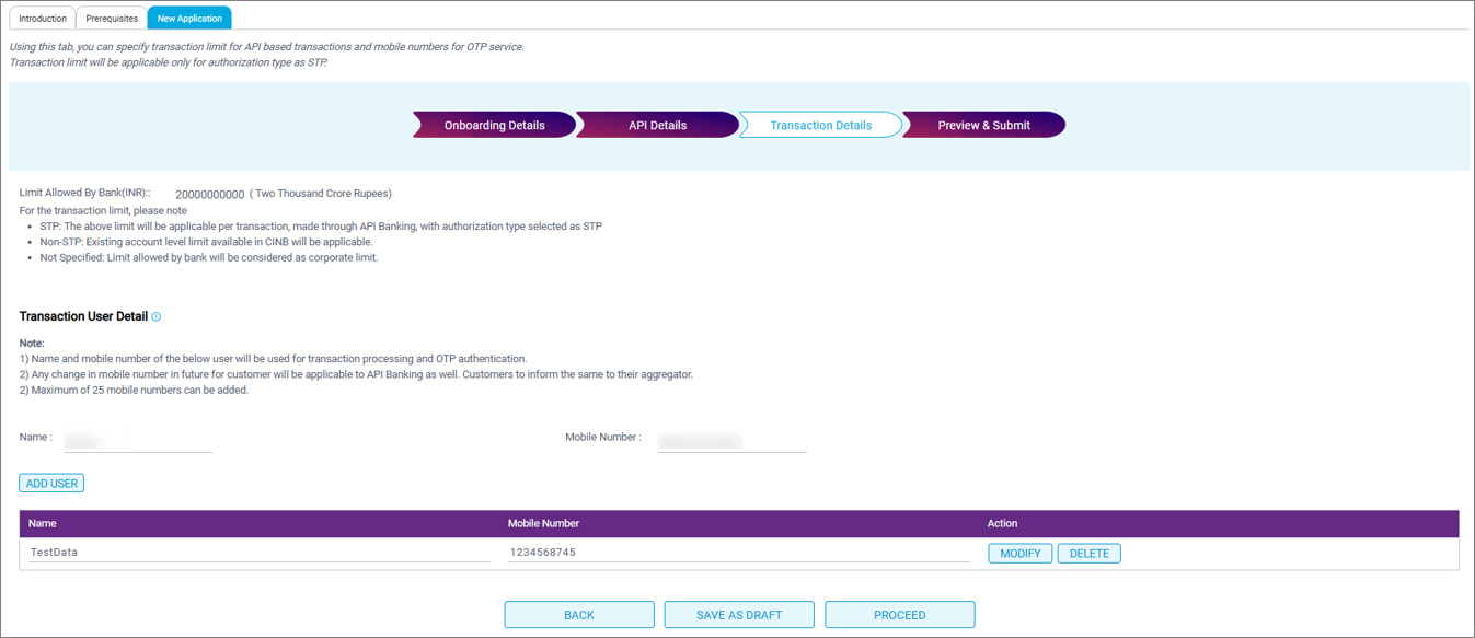 - On the Transaction Details page that contains Limit Allowed by Bank (INR), enter the Limit Set by Corporate (INR).