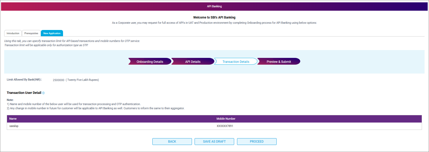 - On the Transaction Details page, review the Limit Allowed by Bank (INR) and your mobile number and click PROCEED.