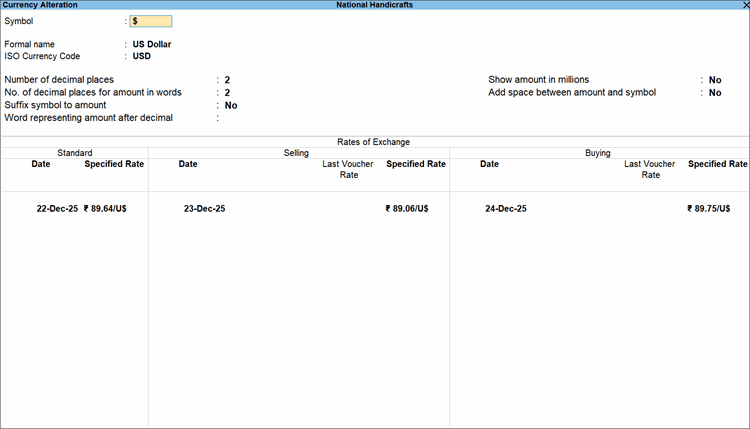 If you use the same symbol for two currencies, TallyPrime automatically prefixes the second currency symbol with letters from its formal name (e.g., “U$”) to avoid confusion. - How do I alter exchange rate? Can it be done multiple times in a day?