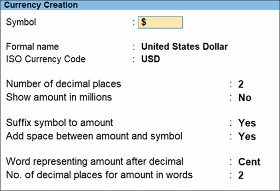 - Press Alt+G (Go To) > Create Master > Currency > and press Enter.