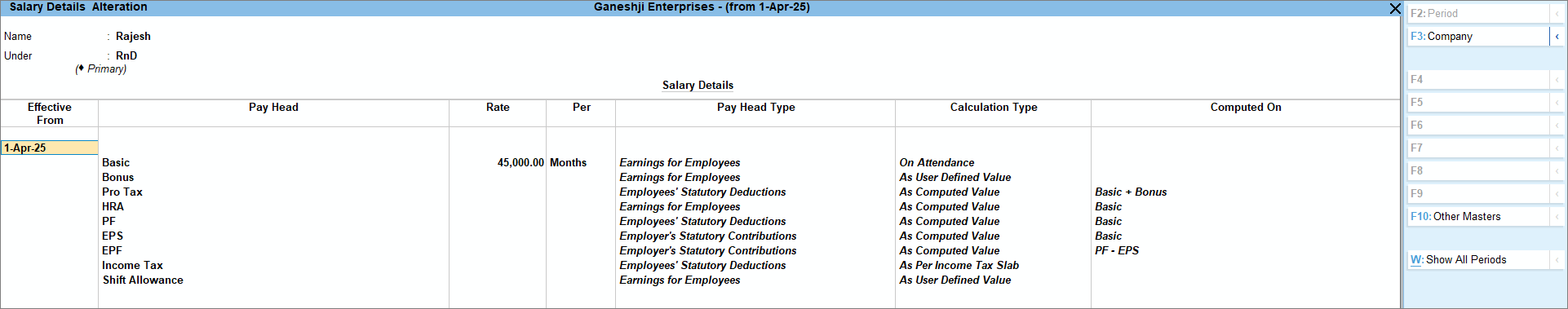 - Press Alt+G (Go To) > Alter Master > type or select Define Salary.