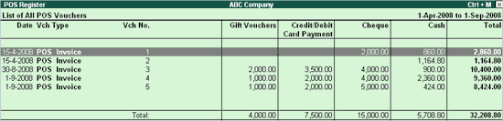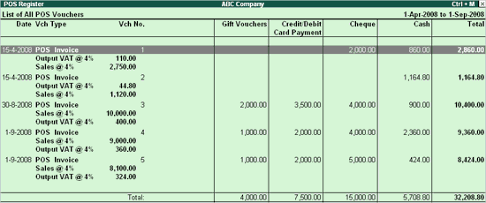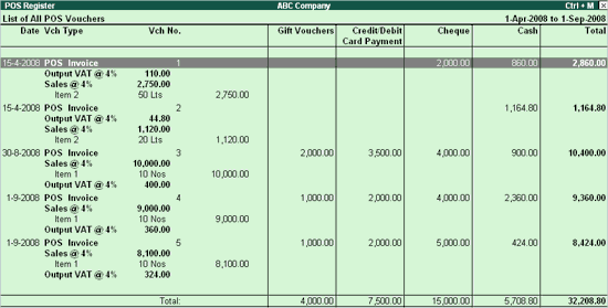 2. Click F1: Detailed to view the report in detailed mode. The POS Register appears as shown below: