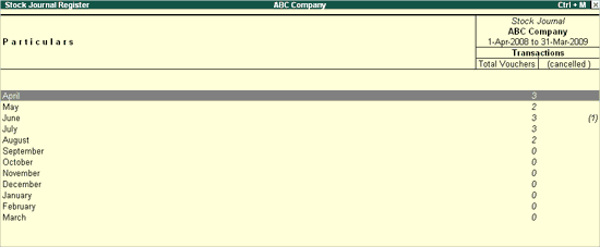 To view the Stock Journal Vouchers for any month, press Enter on any month, all the vouchers of that month will be displayed.