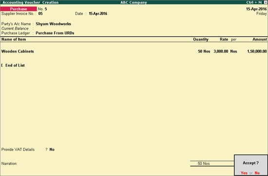 1. Go to Gateway of Tally > Accounting Vouchers > F9: Purchase.