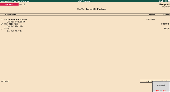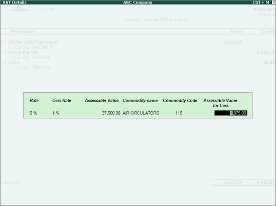 10. Debit the cess ledger. The amount will be displayed automatically. The journal voucher appears as shown below: