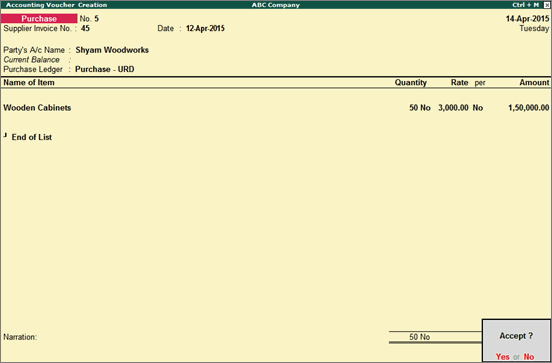 1. Go to Gateway of Tally > Accounting Vouchers > F9: Purchase.