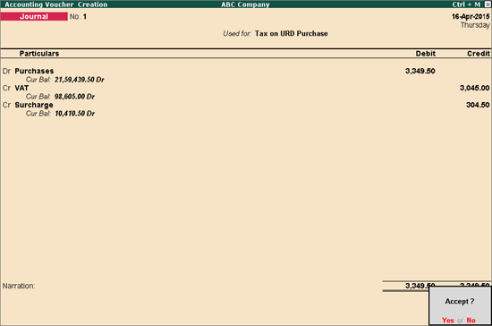 6. Credit the surcharge ledger and enter the VAT Details. The journal voucher appears as shown below: