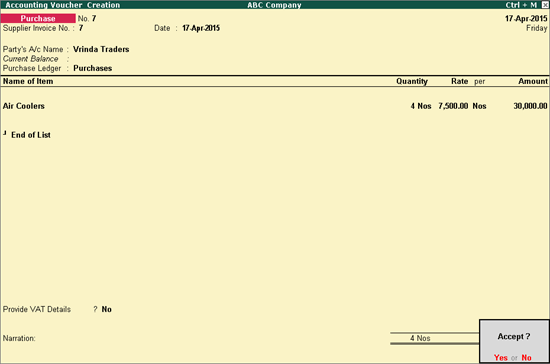 6. Select the required stock item. Enter Quantity and Rate. The purchase invoice appears as shown below: