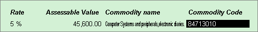 o Enter the Rate, Assessable Value, and Commodity Code, and select the Commodity name of the item purchased in the VAT Details screen. The VAT Details screen appears as shown below: