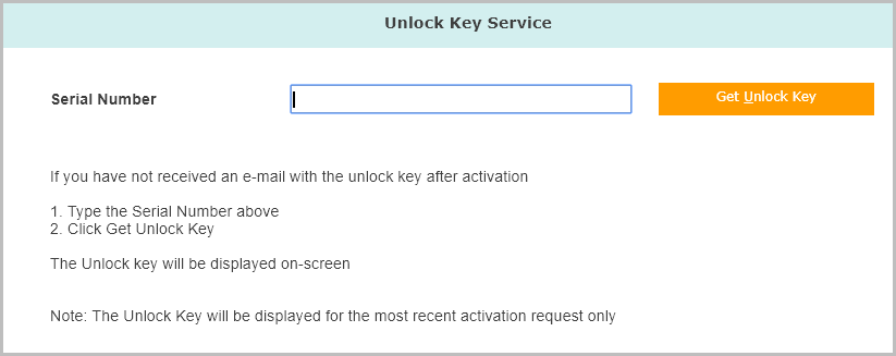 3. Scroll down, and click Get Unlock Key for product activation . The Unlock Key Service screen appears.