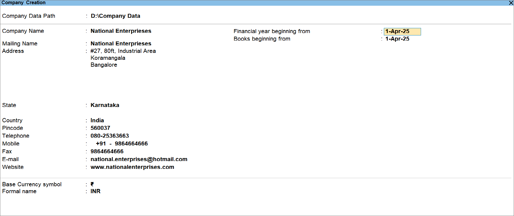 Press Ctrl+A to save the company.At any point in time, if you want to change the company details, then press Alt+K (Company) > Alter, and make the necessary changes.