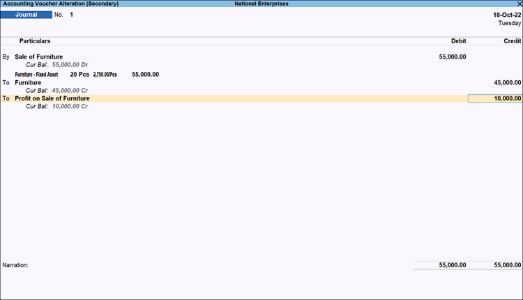 - Under Particulars, select the sales ledger (For example, Sale of Furniture) and enter the Debit amount – the amount for which the asset was sold.