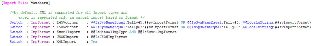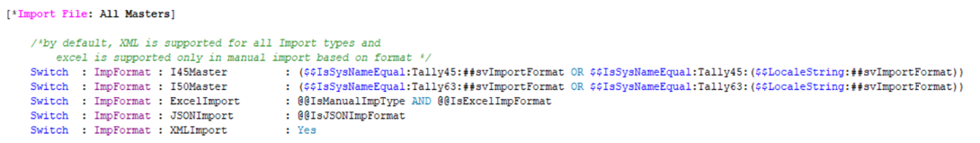 This is done with the help of the definition ‘Import File’. Default TDL already has 2 Import file definitions ‘All Masters’ and ‘Vouchers’, which gets called during Master import and voucher import respectively. As per where the changes are required, the respective import file definition is modified and then with the help of the attributes the changes required are made. For Example, to convert sales voucher into purchase in TallyPrime during import, one would modify the Import File definition ‘Vouchers’ and add respective code to change the voucher type from sales to purchase.