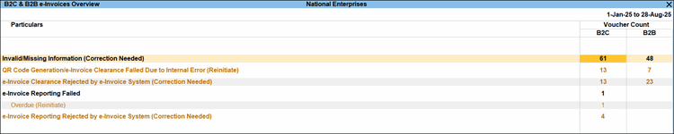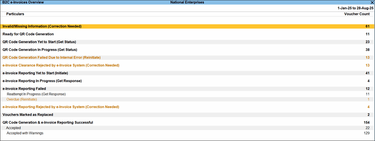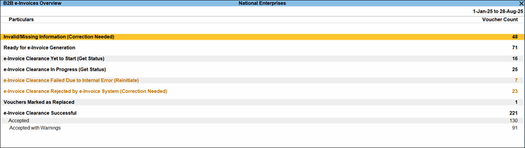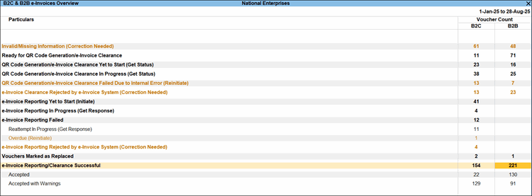 In TallyPrime, you can see the e-Invoice Overview report for B2C (retail sales to unregistered customers), B2B (sales to VAT-registered businesses such as wholesalers or distributors), or both together to know the e-Invoices reporting status for B2C e-Invoices and clearance status for B2B e-Invoices.