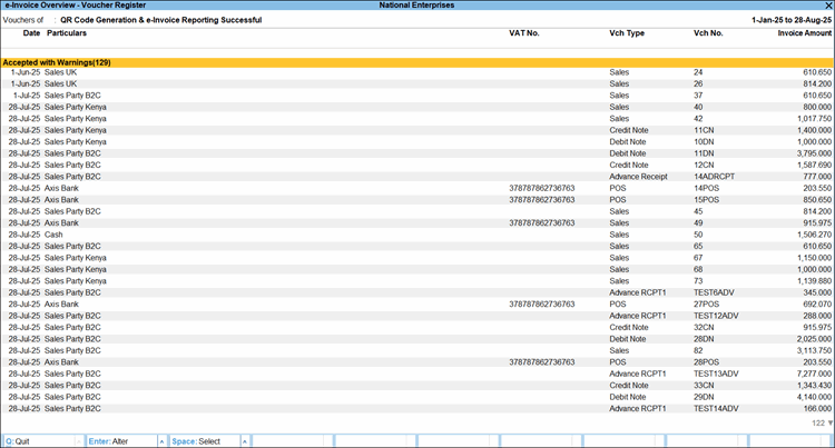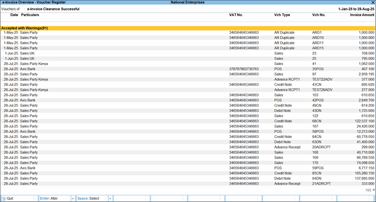 The e-Invoice Overview report in TallyPrime helps you track QR code generation, reporting, and clearance for all invoices, so you can easily identify exceptions and stay compliant.