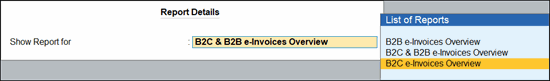 - In the Report Details screen, select either B2C e-Invoices Overview or B2B e-Invoices Overview from the List of Reports.