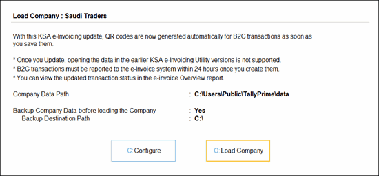 When you load the Company, a one-time message appears on the Load Company screen, informing you about QR code generation for B2C transactions.