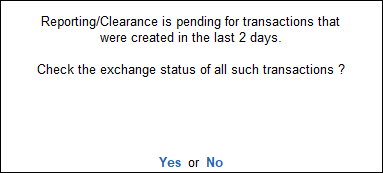This query appears only when there are transactions pending for exchange with the e-Invoice system in the last two days, based on the Current Date on Gateway of Tally.