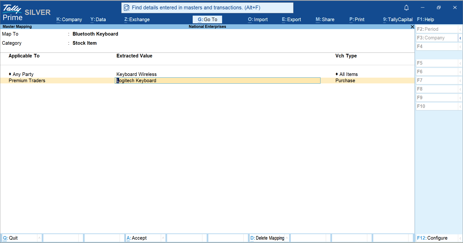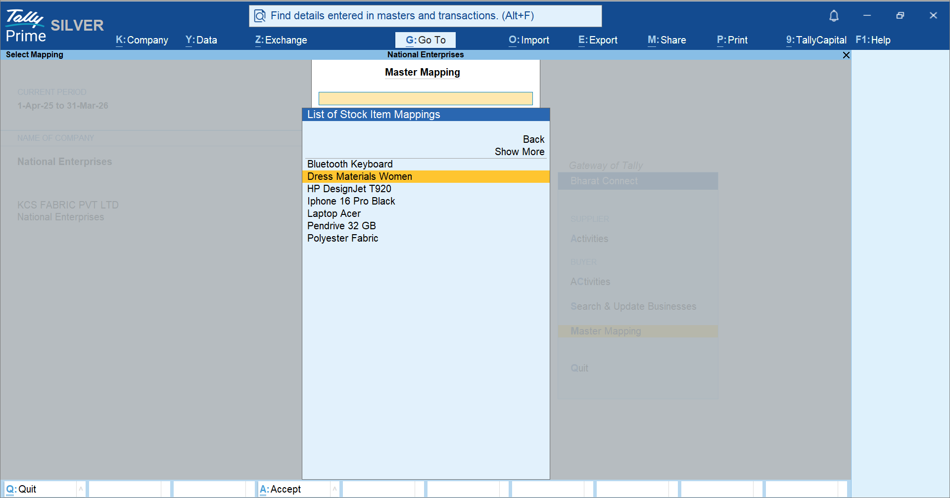 - Gateway of Tally > Bharat Connect > Master Mapping.