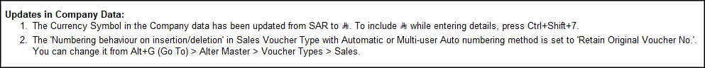 After migrating from TallyPrime 2.1 or earlier to TallyPrime 7.0 or later, Updates in Company Data will display that the currency symbols (SAR, AED, or both) have been updated to the new official symbols, along with the shortcut keys to insert them.