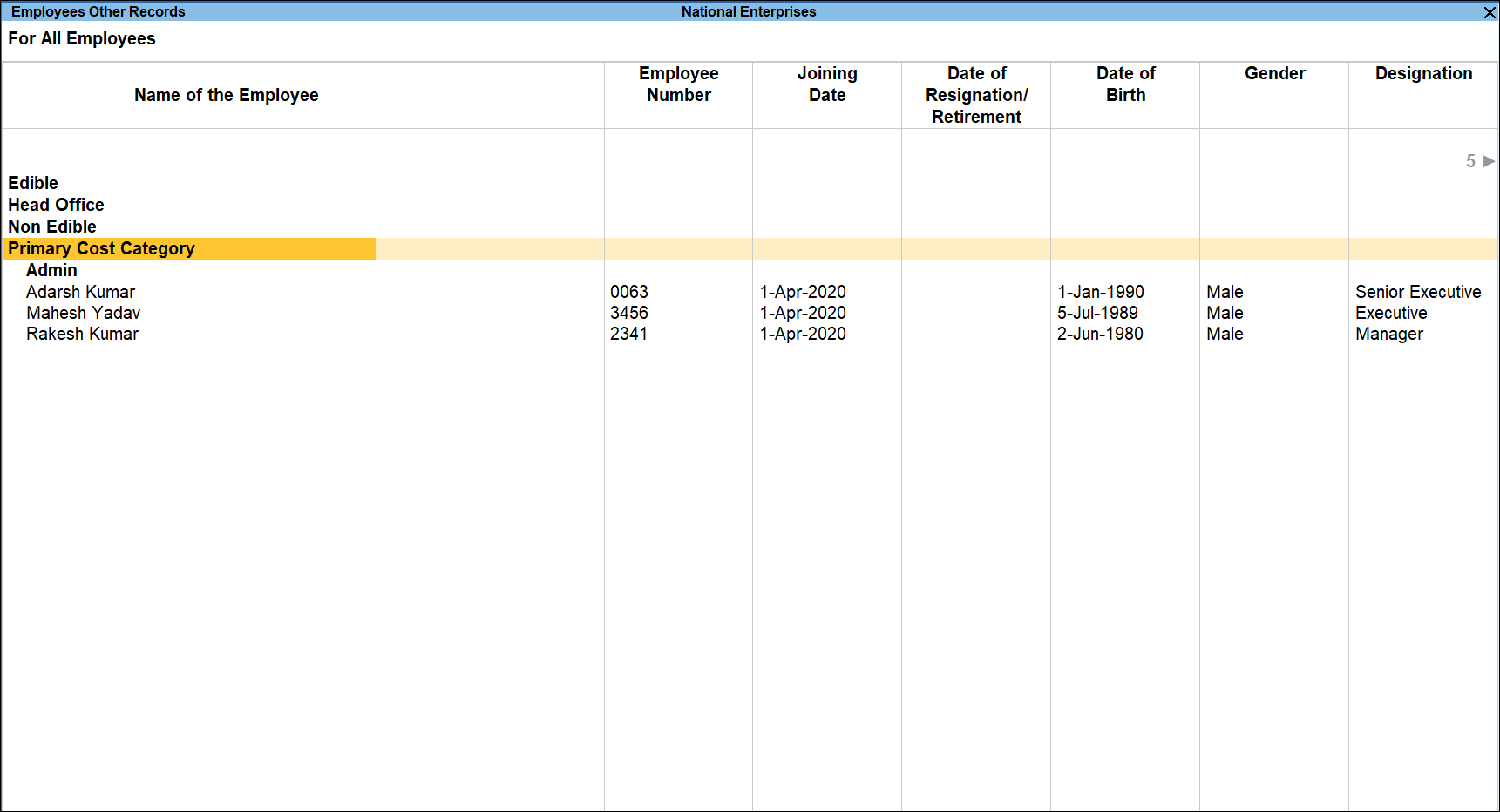 The Other Records report displays Employee’s personal details, contact details and Bank details.