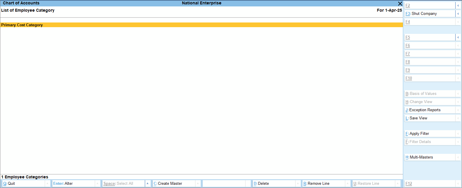 - Press Alt+G (Go To) > Create Master > Employee Category and press Enter.